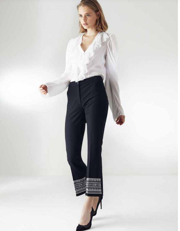 Figure Hugging Trousers with a slight FLARE at hemsline. White Embroidery details at sewn in at the lower front Hems. Front Visible zippers. Best pair of pants trousers for business or casual outings.
