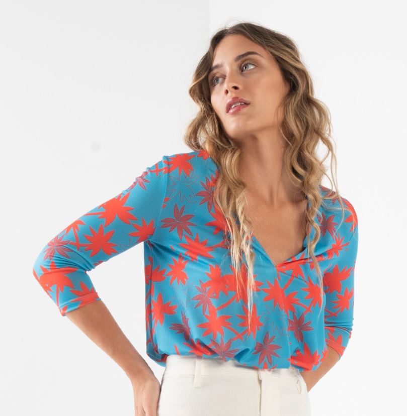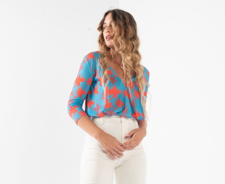 Elastic, stretch bodysuit features a steep V-Neckline and an all-over Orange color palm print on a Turquoise background.